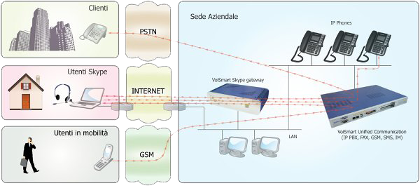 L’utilizzo del gateway con i centralini VoiSmart permette di aumentare notevolmente le prestazioni e le modalità d’uso. VoiSmart Skype Gateway permette, a ogni utente del centralino, di effettuare chiamate verso un qualsiasi account Skype direttamente dai telefoni sulla scrivania dell’ufficio. Il gateway Skype è visto dal centralino VoiSmart come una qualsiasi linea telefonica, quindi l’utente dovrà semplicemente digitare l'estensione numerica associata all’utente Skype da raggiungere. Il gateway instraderà la chiamata attraverso Internet e la rete Skype per raggiungere l'account remoto senza alcun utilizzo delle linee tradizionali. L’utilizzo del VoiSmart Skype Gateway è semplice e immediato e permette l’integrazione del servizio Skype nell’infrastruttura di telefonia aziendale senza difficoltà, sia per l’utilizzatore che per l’amministratore del sistema.